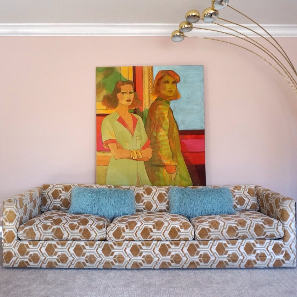 A: My favorite piece is a large scale painting of two women, painted by an unknown artist circa 1973 titled Jealousy. It was my first “big” art purchase and is still my favorite to this day. The two women depicted have very expressive eyes, and yet there is still an air of mystery about them, which has always drawn me to the piece. The style is reminiscent of fashion illustrations from the 70s, which speaks to my love of and background in fashion design. The colors also scream 1970s, with touches of neons and soft primary colors.