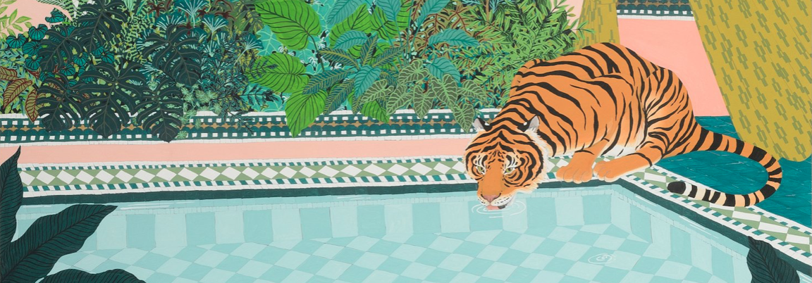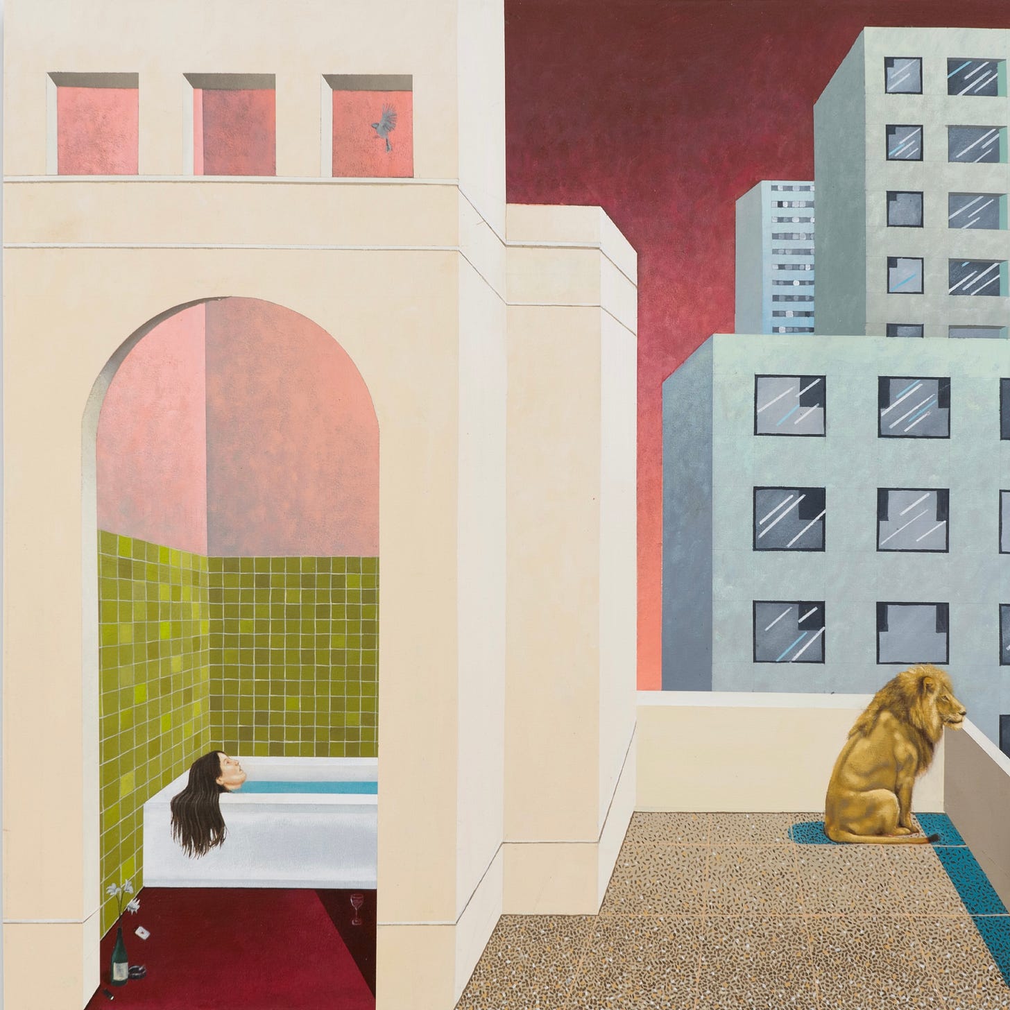 - There are “bodies of water” in each painting— a tub, the blue rug and turquoise carpet, that maroon situation with a night cityscape in the far distance, the pool, the water and ship—and I feel like there is a thread here. Perhaps some aspect of environmentalism?