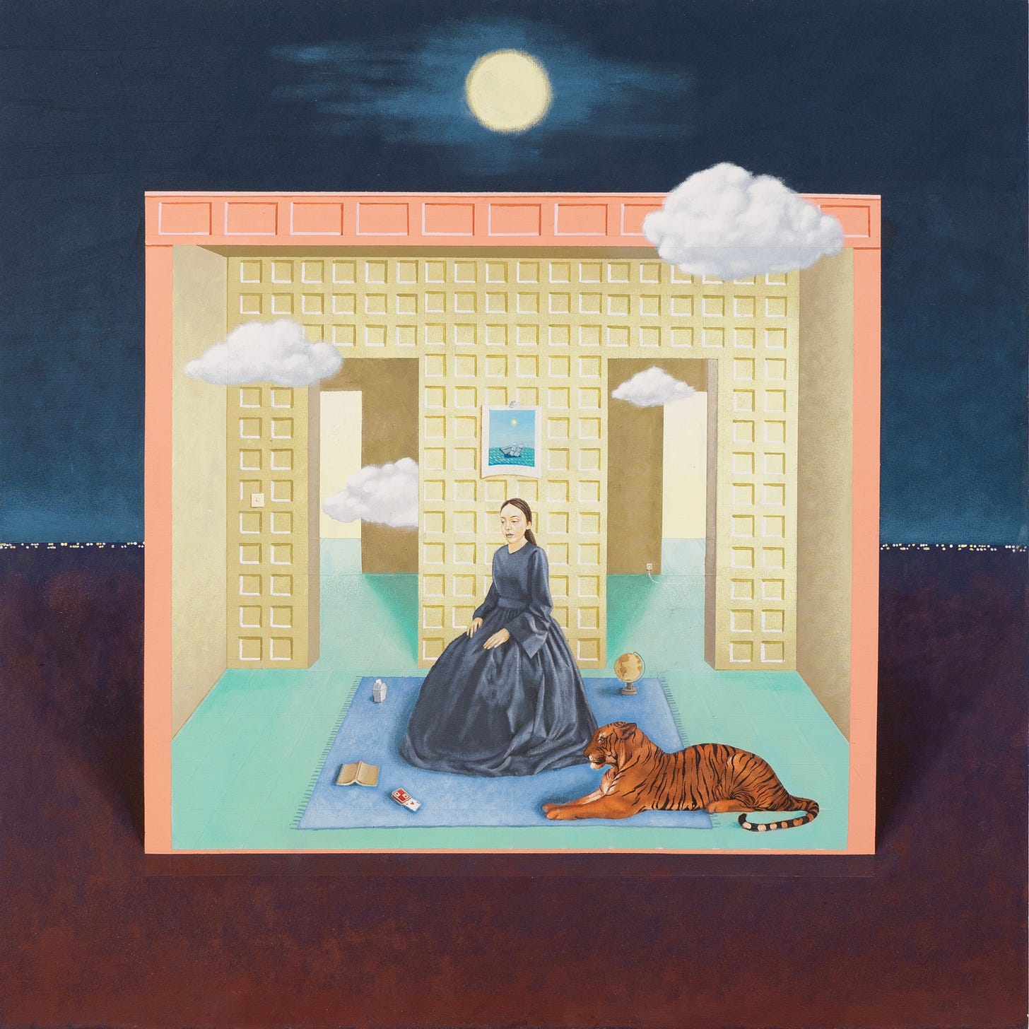 Let’s talk about Katherine Qiyu Su, for example, because a very smart client just bought one of her paintings and she is in the current exhibition Blue Hour at Phillips. Katherine was featured in the Annex at Half Gallery in New York in August 2024, her US debut, and had another solo show earlier in the year. She has been in quite a few group shows in London and Italy. She got her MFA in London in 2023. And she has something really interesting to say and a novel way of saying it. I LOVE it already! But let’s look: