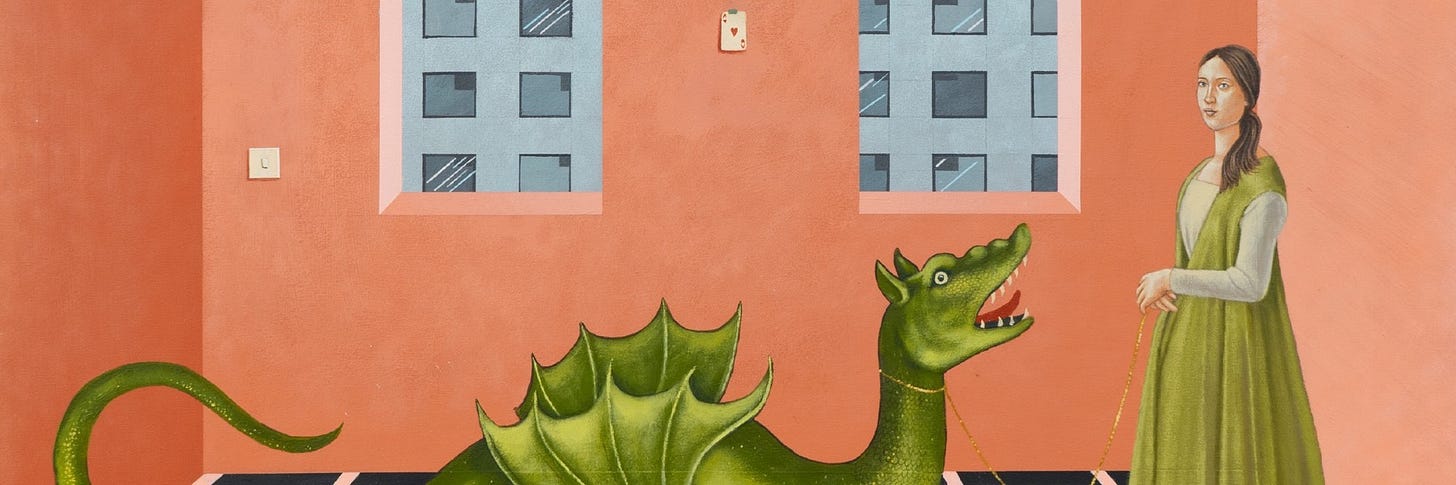 Picture this: You walk into an exhibition by an artist about whom you know nada. The images on the wall are at once familiar and foreign, whimsical and onerous, cheery yet eerie. What do you do? First, take a stroll around and drink it all in. Are there any recurring figures or symbols? Do you see a character show up in multiple compositions? What’s the color palette got going on? Do you feel uncomfortable? What makes you want to keep looking? How did the paint get to the substrate? Can you see the brushstrokes? Can you see piles, pools, or puddles of paint (impasto is the technical term) on the surface? Do the images remind you of anything else you have seen?