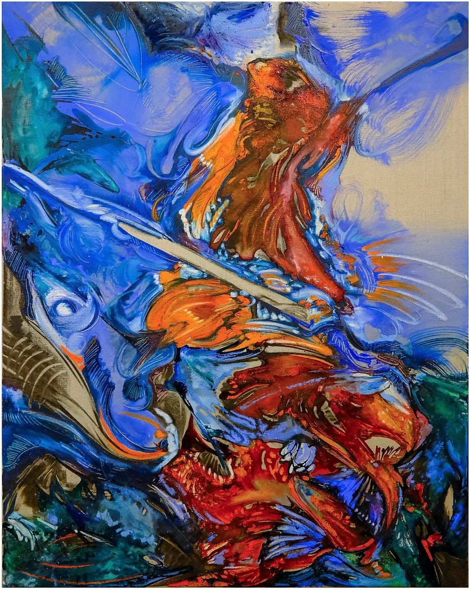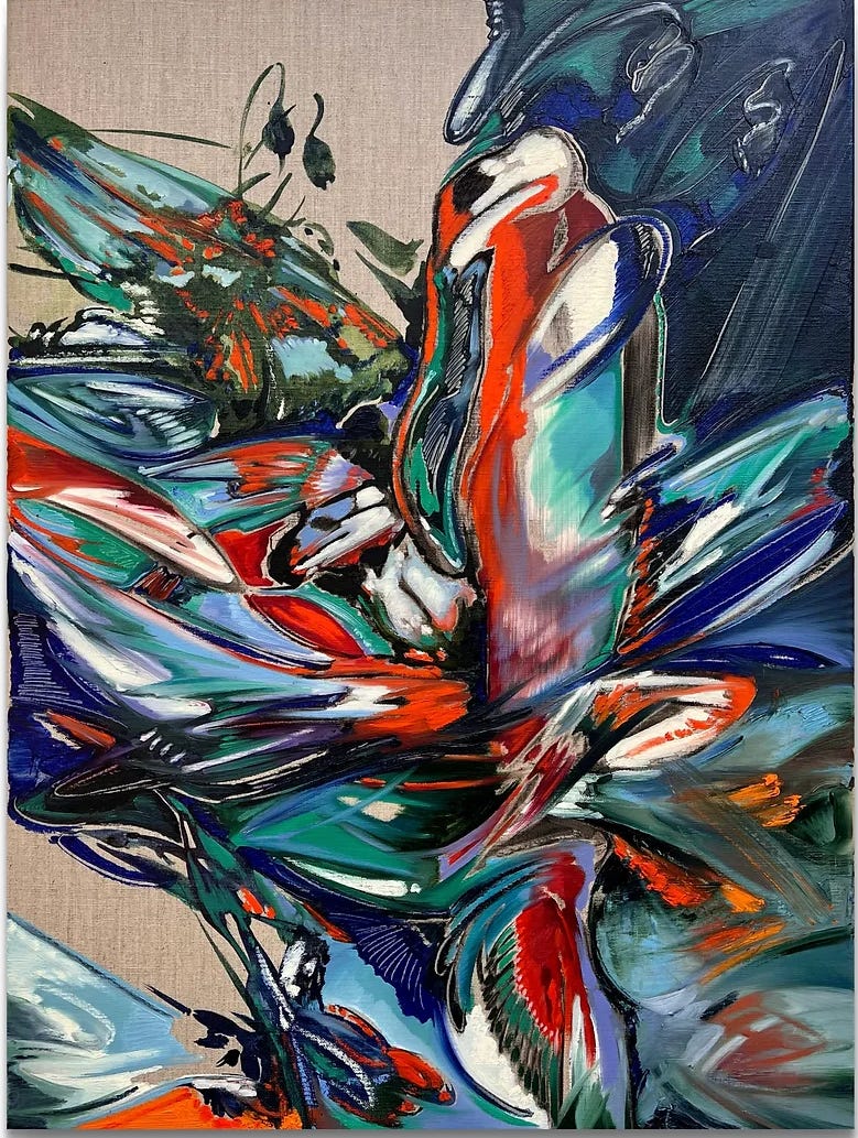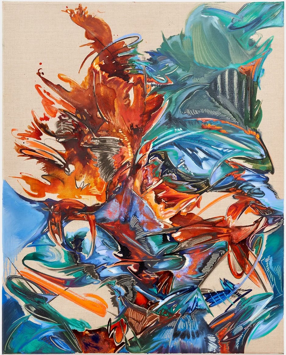 Let’s talk about Katherine Qiyu Su, for example, because a very smart client just bought one of her paintings and she is in the current exhibition Blue Hour at Phillips. Katherine was featured in the Annex at Half Gallery in New York in August 2024, her US debut, and had another solo show earlier in the year. She has been in quite a few group shows in London and Italy. She got her MFA in London in 2023. And she has something really interesting to say and a novel way of saying it. I LOVE it already! But let’s look:
